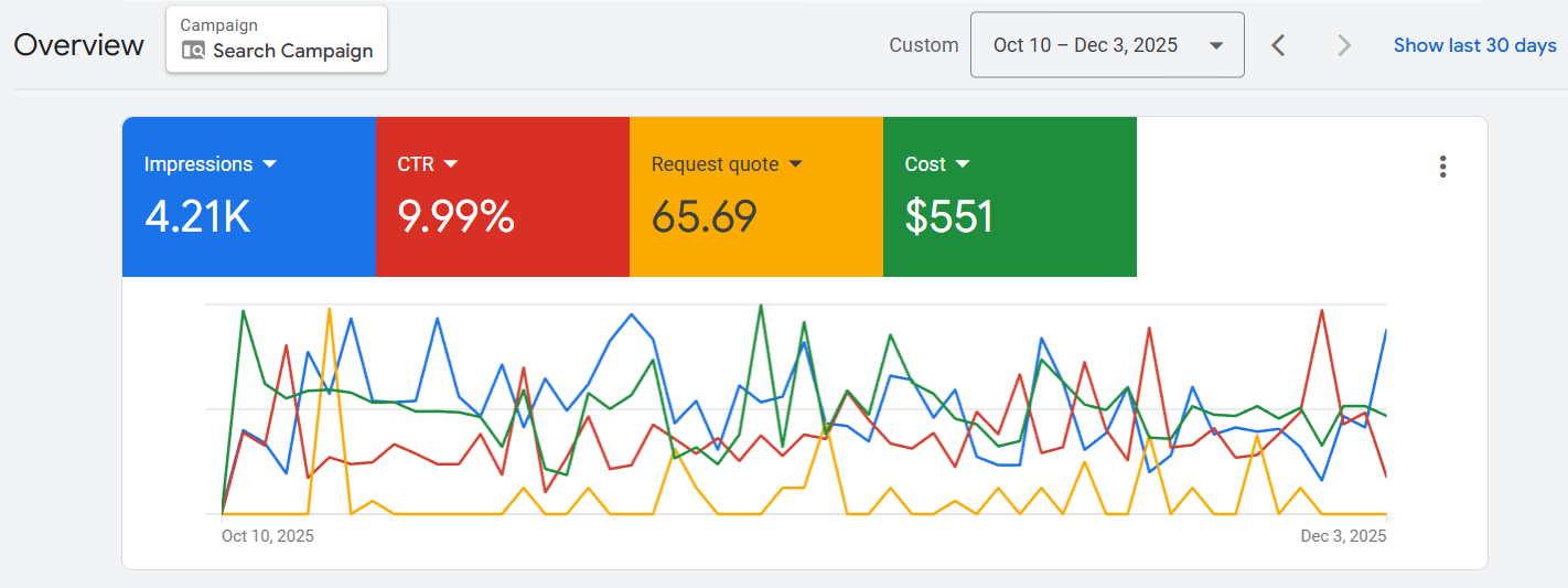 In the first 60–90 days of running SEO + Google Ads, these are the following results: